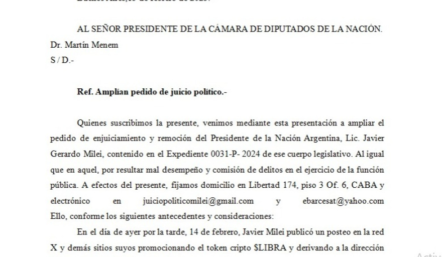 Dicha ampliación – con fecha del sábado 15 de febrero de 2025 – del Expediente 0031-P- 2024, lo firman Adolfo Pérez Esquivel, Hugo “Cachorro” Godoy, Eduardo Barcesat, Alicia Castro, Taty Almeida, Carlos Rozanski, Cynthia García, Claudio Lozano, Jorge Elbaum, Liliana Hendel y Natalia Amatiello.