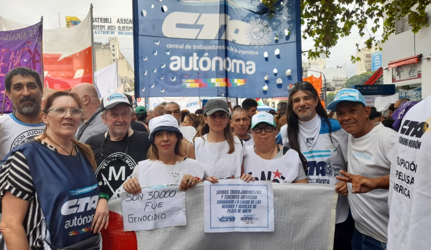 “Una vez más presentes por memoria, verdad y justicia, ratificando que son 30 mil detenidos desaparecidos, el juicio y el castigo a los culpables, y por supuesto ligando esta histórica lucha por el Nunca Más, con la lucha presente, que es por un país soberano, con trabajo y producción, donde la democracia sea la forma de resolver las cosas y donde redunde la justicia social” señaló Oscar “Colo” De Isasi, el secretario General de la CTA A Bonaerense, quien encabezó la delegación provincial de la Central en la marcha.