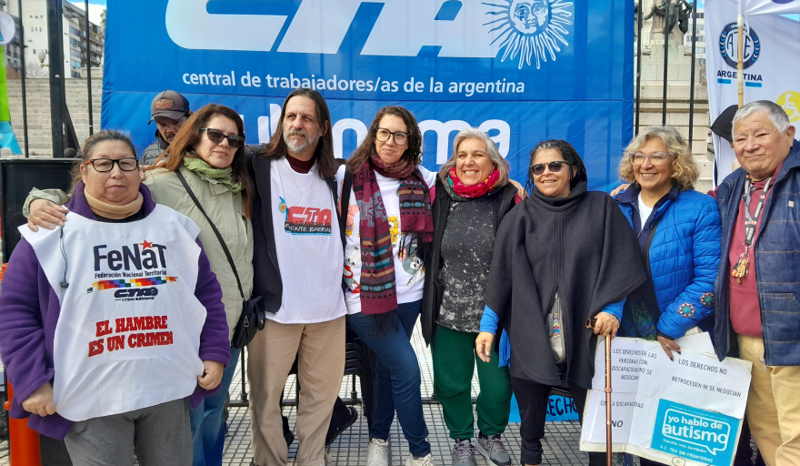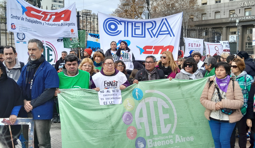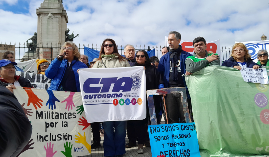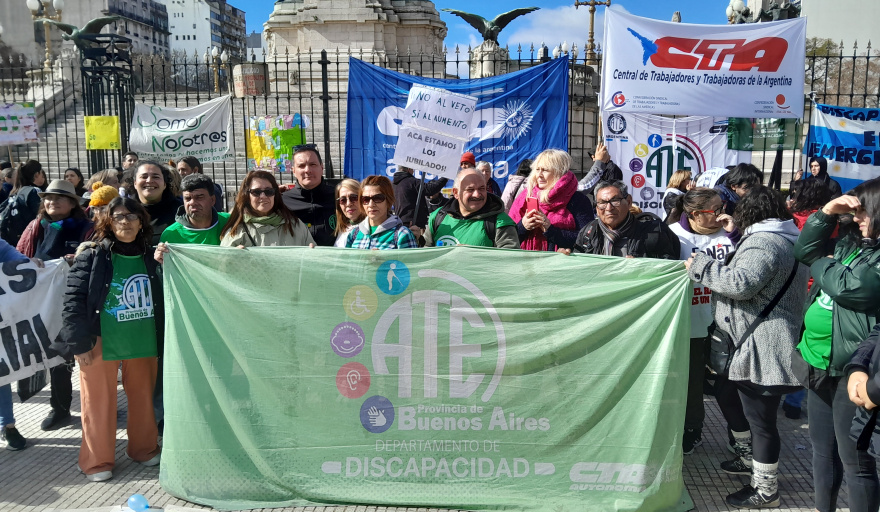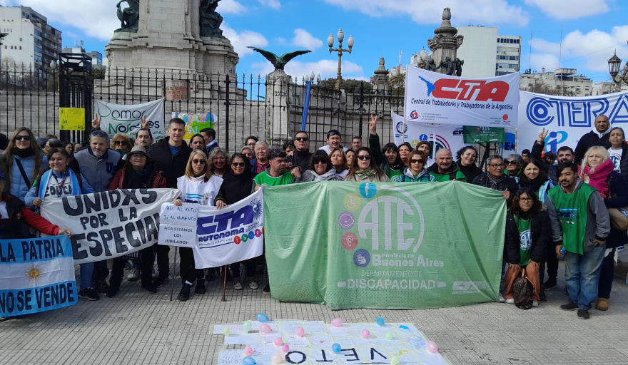Una delegación de la CTA Autónoma Bonaerense movilizó este martes frente al Congreso de la Nación en repudio al veto presidencial a la Ley de Emergencia en Discapacidad que había tenido un amplio apoyo en ambas cámaras del Congreso, y que deja ahora en una situación extrema a miles de personas que padecen diversas afecciones.
