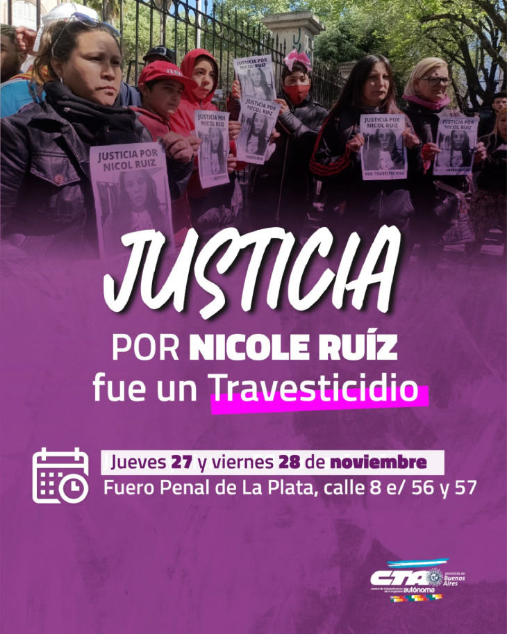Nos concentramos en las puertas de tribunales a partir de las 8.30 hs en calle 8 entre 56 y 57 de la ciudad de La Plata los días jueves 27 y viernes 28 de Noviembre.