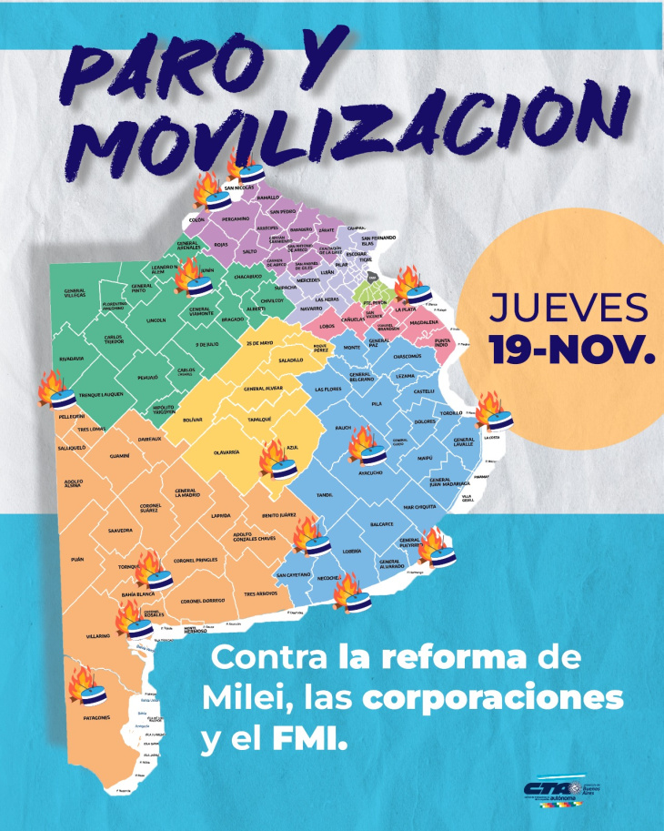 En sintonía con lo dispuesto por las conducciones nacionales de las CTA y la CGT, la provincia de Buenos Aires se prepara para hacer sentir en forma contundente la medida de fuerza contra la avanzada del poder económico a través de su representación política sobre los derechos laborales de la clase trabajadora. La acción principal tendrá como punto de concentración las calles Bernardo de Yrigoyen y Avenida de Mayo, donde luego de un acto, se movilizará masivamente al Congreso de la Nación a las 12 horas.