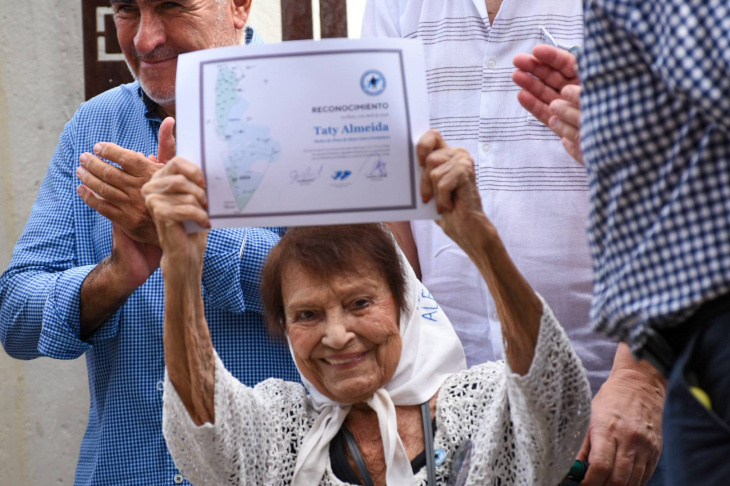 También la Madre de Plaza de Mayo, Taty Almeida, fue reconocida por los ex combatientes, y aseguró que “hoy se cumplen 44 años de esa injusta guerra declarada por ese deplorable gobierno militar que decidió mandar al muere a tantos jóvenes que iban a defender a Argentina” y pidió “reflexionar y gritar por esos pibes que nunca volvieron pero van a seguir estando”.