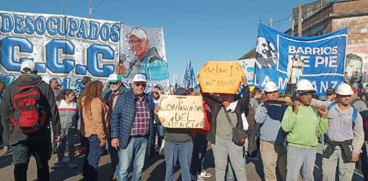 La grave crisis laboral, alimentaria y sanitaria, contrasta con las cifras oficiales de pobreza brindada por el gobierno. En ese marco, ayer por la mañana se llevó adelante la jornada de lucha que rechazó el fin del programa nacional que fuera ideado como Potenciar Trabajo y reclamó la creación de "trabajo genuino". La CTA Autónoma y ATE estuvieron representadas por representadas Orestes "Beto" Galeano, Miguel Federico respectivamente. Gladys Arrieta de UPP FeNaT representó a la Mesa Provincial bonaerense. La Corriente Clasista y Combativa (CCC) estuvo liderada por el exdiputado nacional Juan Carlos Alderete mientras que por Barrios de Pie, encabezó Viviana Oscari.